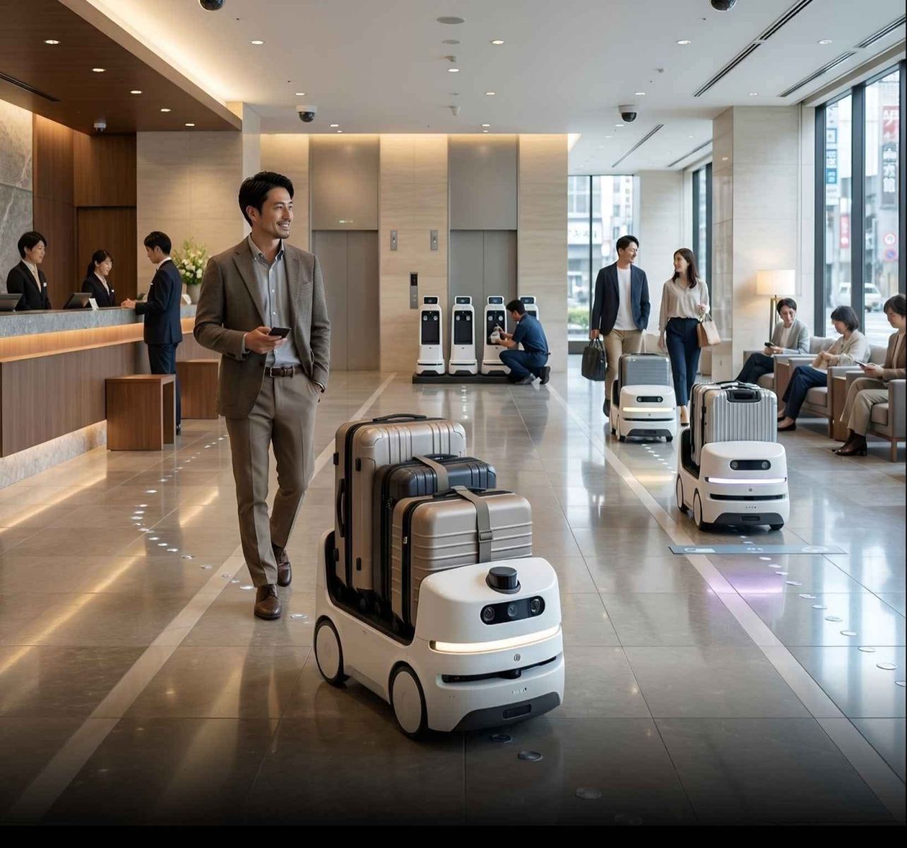 Và rồi khoảnh khắc bạn bước dọc hành lang, phía sau là robot nhỏ với ánh đèn xanh chạy theo từng nhịp chân – đó chính là cách Nhật Bản khéo léo cho du khách thấy tương lai đang nhẹ nhàng tiến đến, từng chút một.